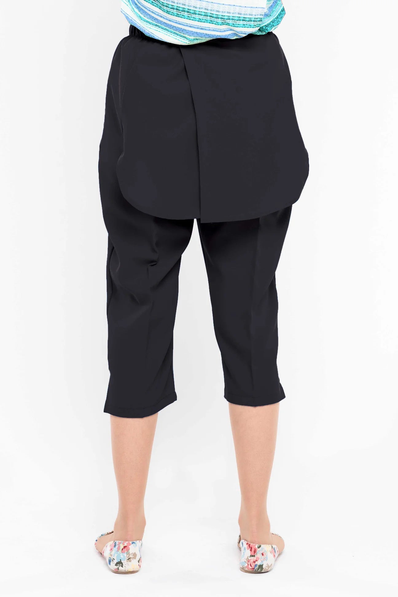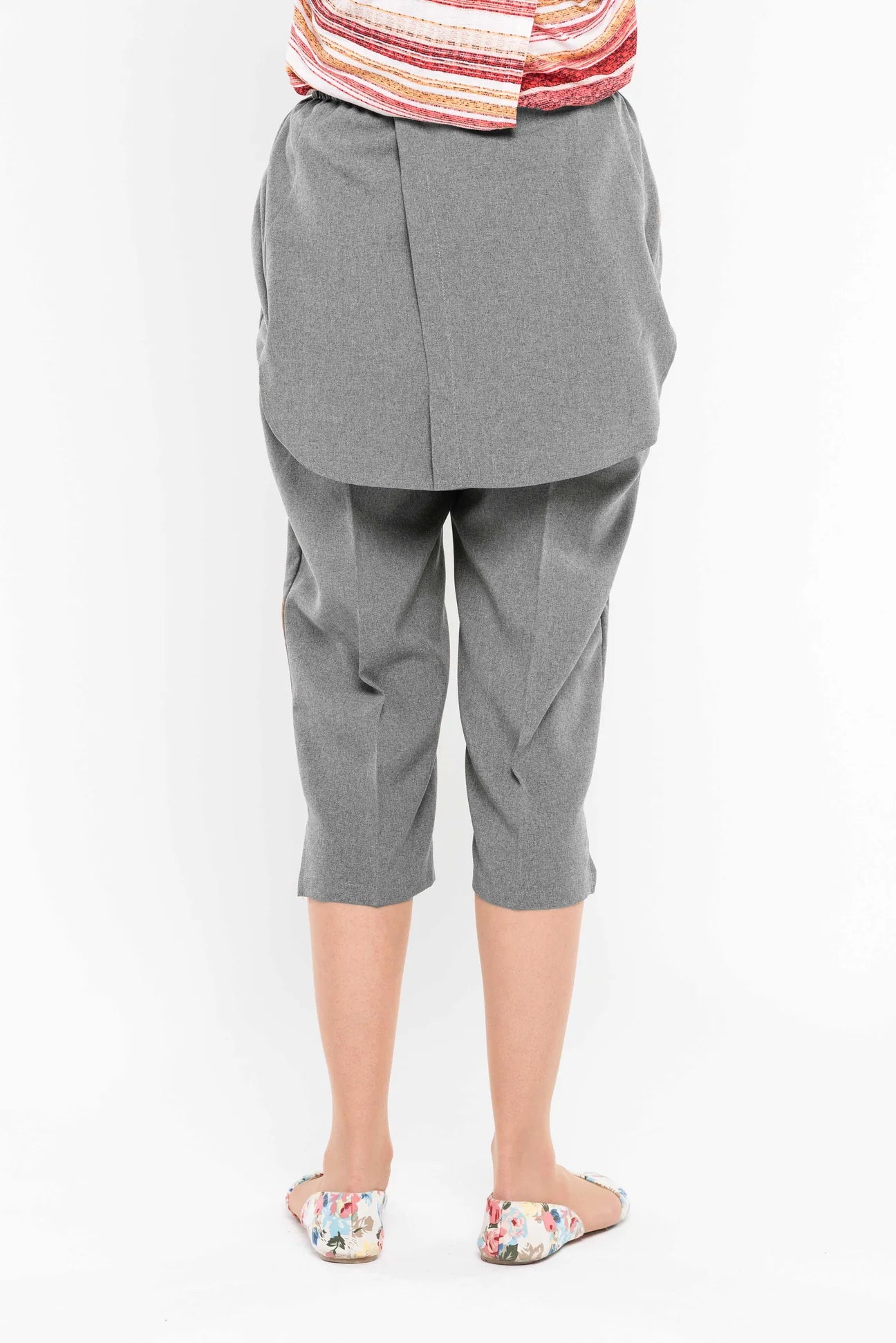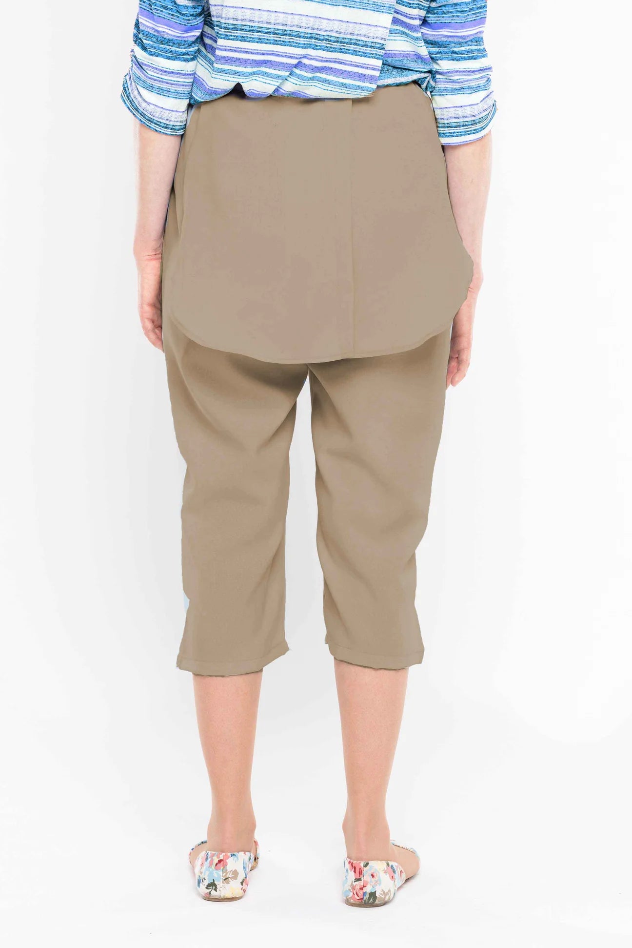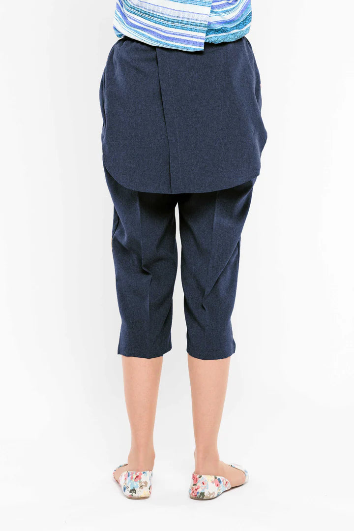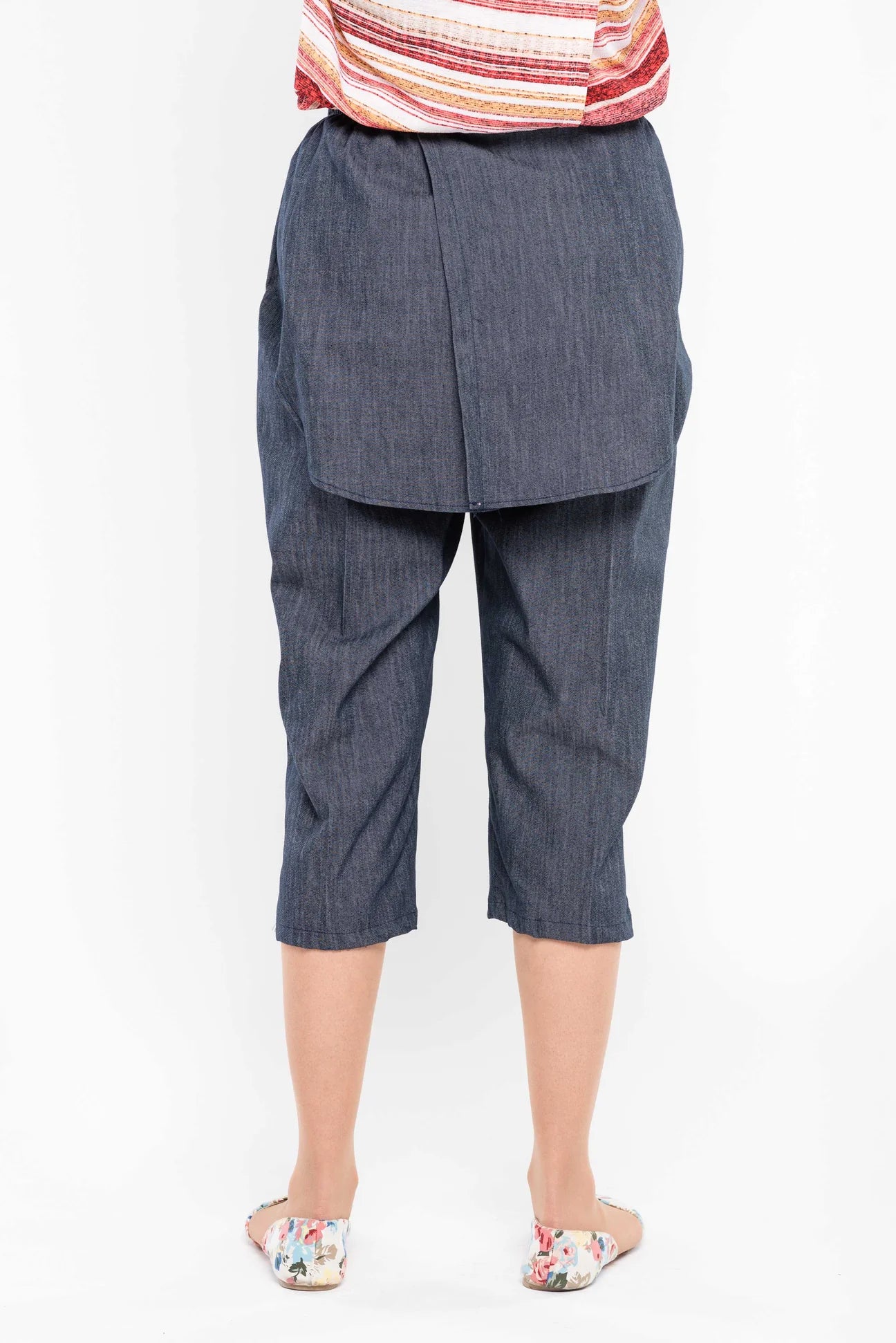 Capri pants with a back opening that closes with snaps. The panels conceal the incontinence layer. Elastic waistband and loose fit for added comfort. Machine-washable and dryable denim fabric.